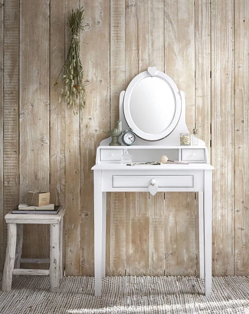 Avec la charmante coiffeuse 3 tiroirsblanche VALENTINE, votre princesse a elle aussi le droit à son petit coin beauté. Orné d’un joli miroir, cette coiffeuse dispose également de petits tiroirs pour ranger des accessoires ou du maquillage. On craque pour ses petits coeurs qui apportent une note romantique au meuble.