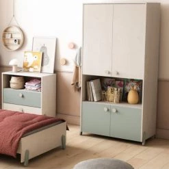 Calicosy Armoires Enfant Armoire Enfant 4 Portes Avec Penderie, DĂ©cor Bois Et Vert – L89 Cm