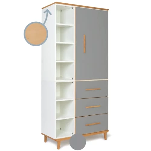 Grâce à ses 7 niches qui peuvent accueillir des cubes de rangement en bois massif (vendus séparément), sa tringle à vêtements coulissante, sa grande étagère et ses 3 tiroirs, elle est très fonctionnelle ! De plus, le système de fermeture “Soft Close”, doux et silencieux, assure un maximum de confort et de sécurité.