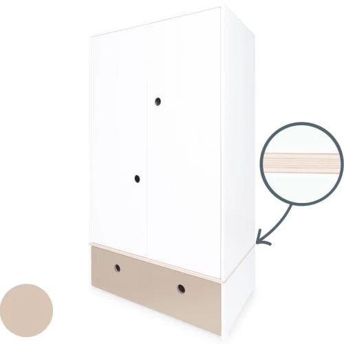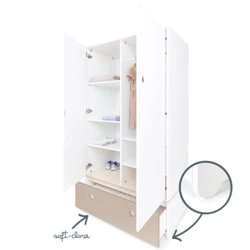 L’armoire enfant 2 portes COLORFLEX est équipée de deux grandes portes et d’un tiroir, séparés par une planche de contreplaqué de bouleau. Le système de fermeture “Soft Close”, doux et silencieux, assure un maximum de confort et de sécurité.