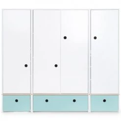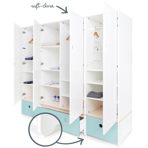 L’armoire enfant 4 portes COLORFLEX est équipée de 4 grandes portes et de 3 tiroirs, séparés par une planche de contreplaqué de bouleau. Le système de fermeture “Soft Close”, doux et silencieux, assure un maximum de confort et de sécurité.