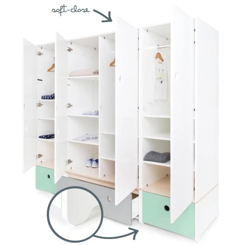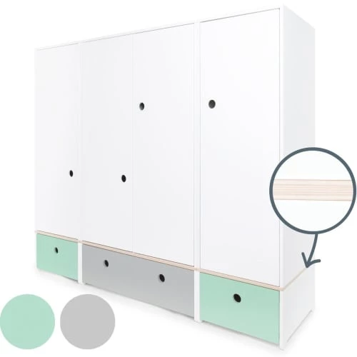 L’armoire enfant 4 portes COLORFLEX est équipée de 4 grandes portes et de 3 tiroirs, séparés par une planche de contreplaqué de bouleau. Le système de fermeture “Soft Close”, doux et silencieux, assure un maximum de confort et de sécurité.